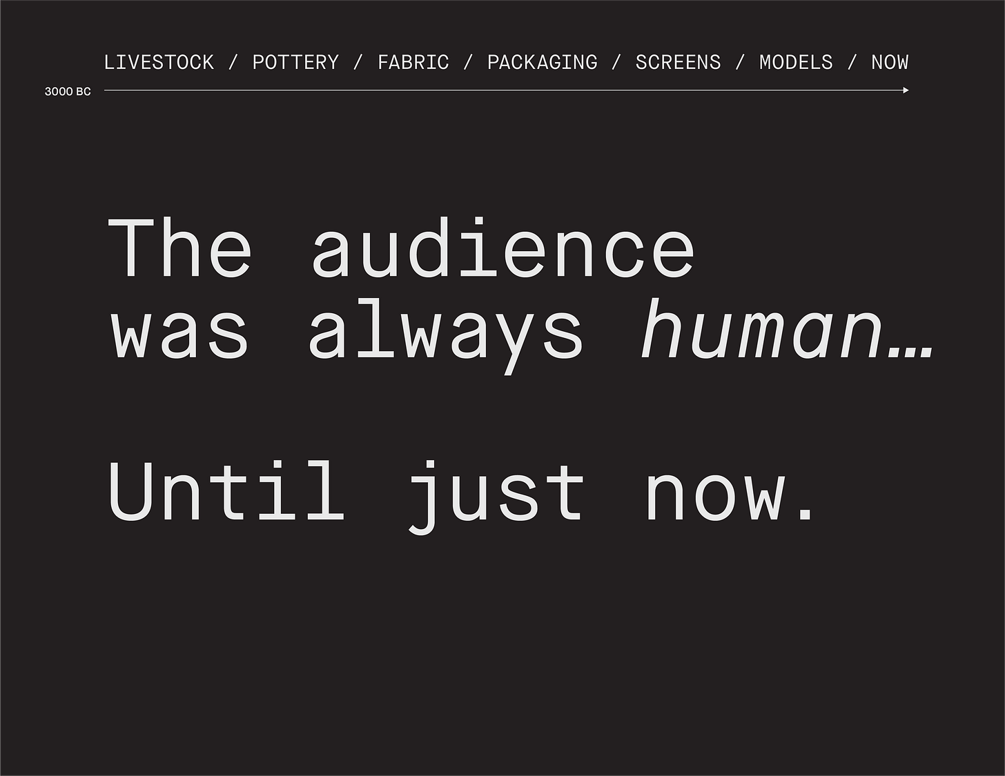 For 5,000 years, brand was a conversation between humans. A mark burned into something of value, read and trusted by another human on the other side. The discipline was built entirely around that exchange.