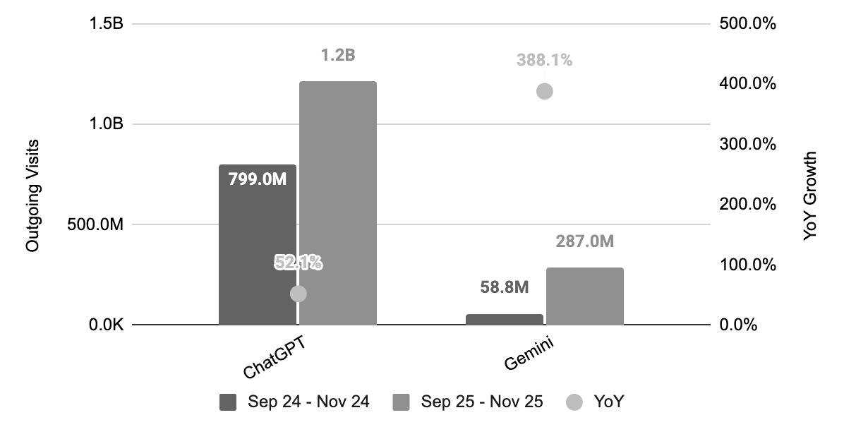 ChatGPT sent 1.2 billion referral visits in Q4 2025 — up 52% year-over-year. Gemini grew 388% in the same period. These are platforms recommending products and brands to hundreds of millions of people, right now. Source: Similarweb via Digiday, Sep–Nov 2025.