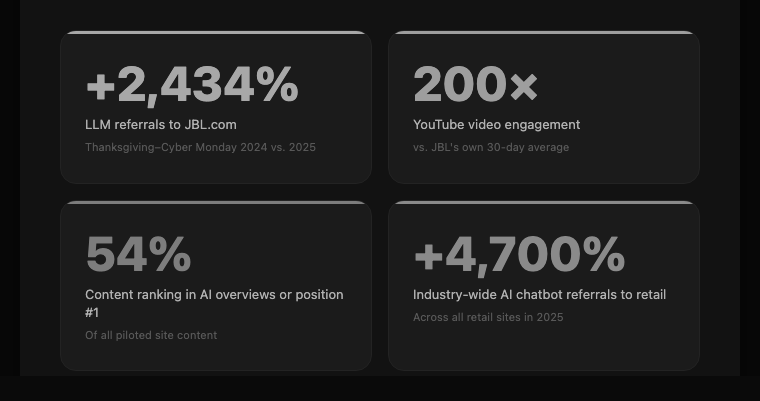 The proof is already in the numbers. JBL, the audio equipment maker, quietly rebuilt its brand architecture for AI-readable discovery last year — structuring content around how language models understand categories, not just how humans search. During Black Friday and Cyber Monday 2025, referrals to JBL’s website from large language models were up 2,434% year-over-year. One brand. One deliberate shift in how clearly it communicated its identity to machines.