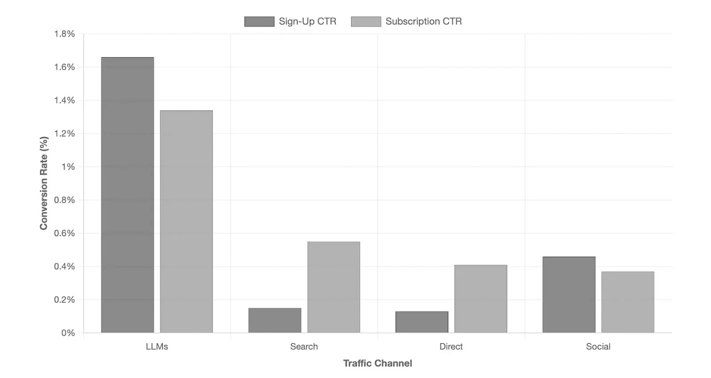 Traffic from LLMs converts to sign-ups at 1.66% — vs 0.15% from search. More than 10x. The brands that get found by AI don’t just get more traffic. They get better customers. Source: Microsoft Clarity, analysis of 1,200+ websites, 2025.