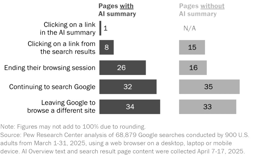 When AI summaries appear in Google search results, users are nearly half as likely to click through to a website — dropping from 15% to 8%. The machine answered the question. Your brand never got a look in. Source: Pew Research Center, 68,879 searches, March 2025.